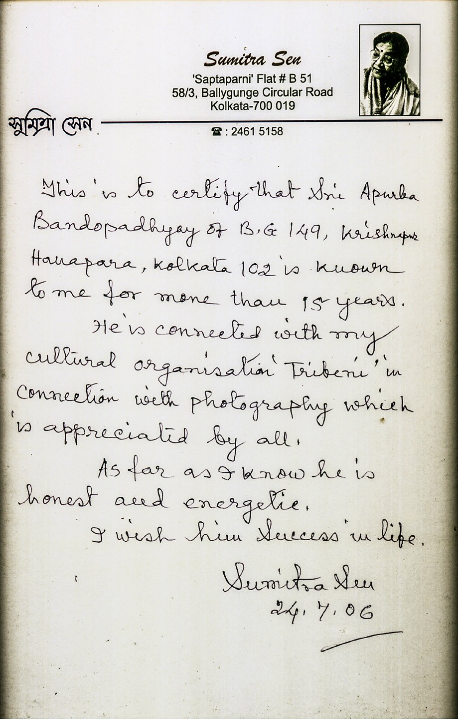 Apurba has won many honours’ & recognition for his photography. Bohurupee, the famous name in theatre world, published a book by the theatre, called"Photographs" on the occasion of their 60 years'anniversary. Here one famous name mentioned is that of Apurba Banerjee. His rare photographs of ‘Satyajit Roy with ‘Marshal Marshow,’ is preserved at the Satyajit Roy Archive at Nandan Film Center, Kolkata.